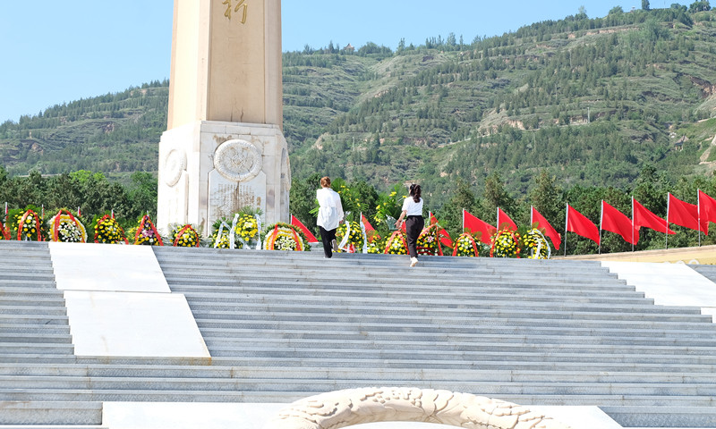向烈士紀(jì)念碑敬獻(xiàn)花籃,默哀致敬