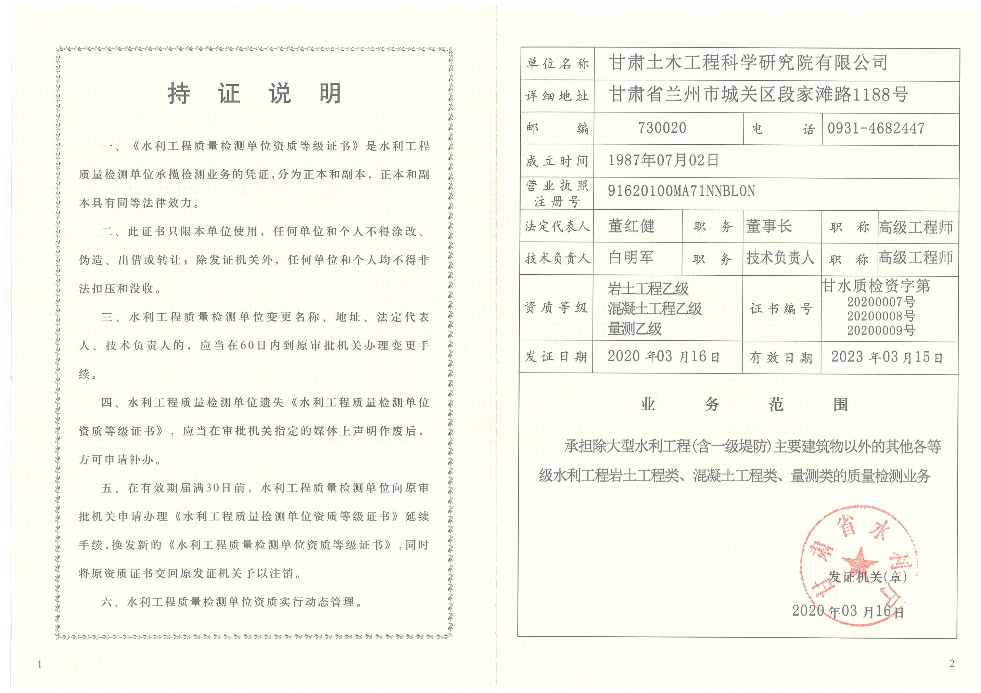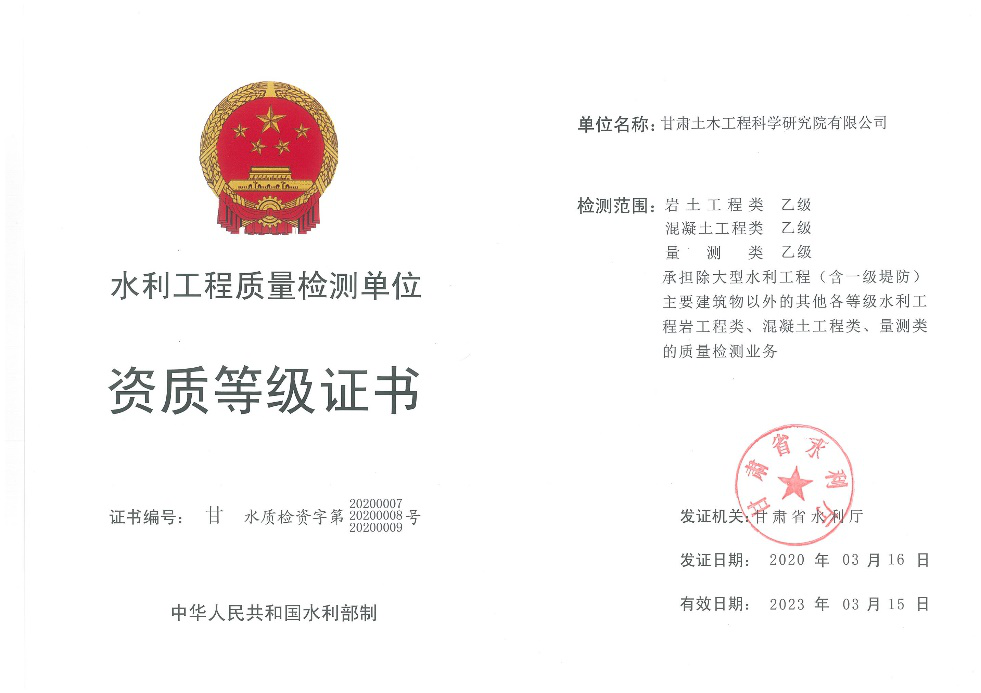 3月16日,公司申報的水利工程質(zhì)量檢測資質(zhì)獲得審批,取得巖土工程類乙級、混凝土工程類乙級、量測類乙級資質(zhì)證書。