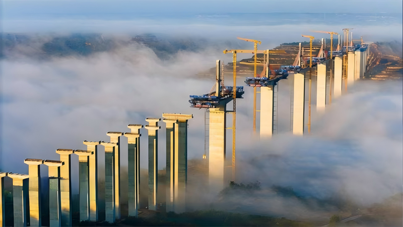 晨光初現(xiàn),建設(shè)中的橋梁在薄霧中若隱若現(xiàn),跨越河流、連接兩岸,為隴東大地經(jīng)濟騰飛插上翅膀。