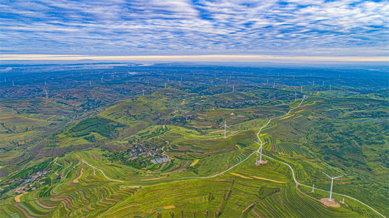 梯田蜿蜒起伏,村莊錯落有致,云海連綿不絕,風(fēng)車悠然旋轉(zhuǎn),織就了人與自然和諧共生的美麗畫卷。
