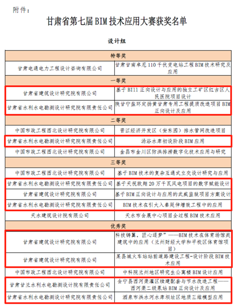 在甘肅省第七屆BIM技術(shù)應(yīng)用大賽中,建筑設(shè)計院、水電設(shè)計院報送的項目共斬獲12項獎勵,包攬了設(shè)計組16個獎項中的10項。在甘肅省第五屆“創(chuàng)新杯”工業(yè)設(shè)計大賽中,水電設(shè)計院《引調(diào)水工程數(shù)字化BIM建模平臺》項目獲優(yōu)秀獎。在第十七屆全省職工優(yōu)秀技術(shù)創(chuàng)新成果獎中,水電設(shè)計院、土木工程院申報的兩個項目分獲創(chuàng)新成果獎三等獎,其中,《棄渣場三維設(shè)計平臺》項目是全省水利系統(tǒng)唯一獲獎成果。