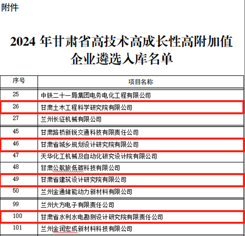 近日,甘肅省科技廳公布2024年甘肅省高技術(shù)高成長性高附加值(簡稱“三高”)企業(yè)名單,甘肅工程咨詢集團(tuán)旗下省建筑設(shè)計(jì)院、省水電設(shè)計(jì)院、省城鄉(xiāng)規(guī)劃院、甘肅土木工程院從眾多企業(yè)中脫穎而出,成功登上全省首批“三高”企業(yè)榜單。