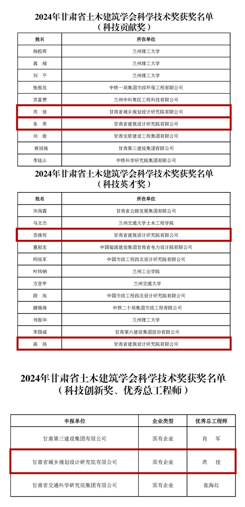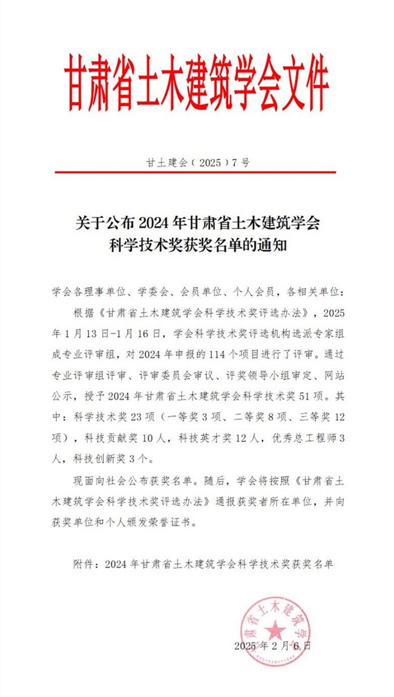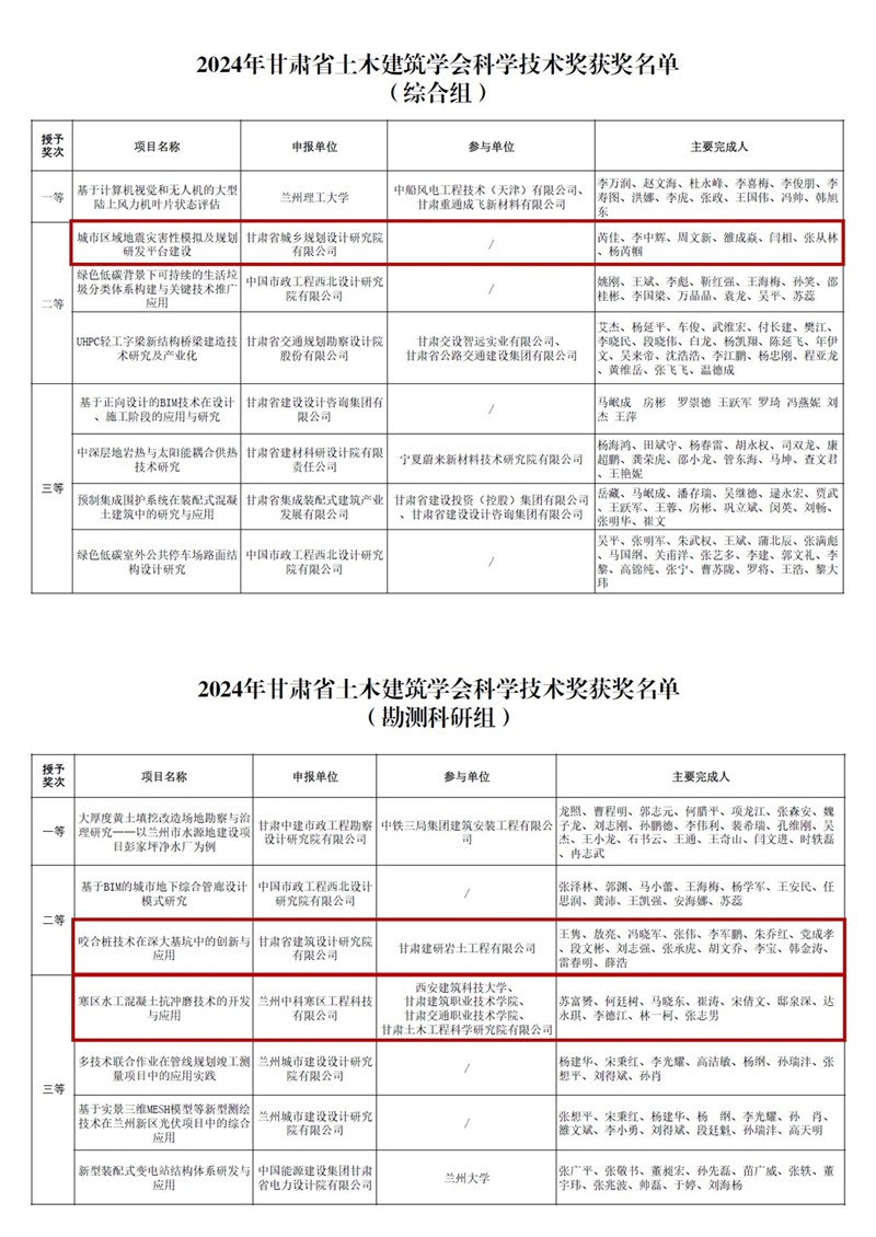 近日,2024年甘肅省土木建筑學(xué)會科學(xué)技術(shù)獎獲獎結(jié)果公布,甘肅工程咨詢集團(tuán)斬獲多項(xiàng)榮譽(yù)。其中,省建筑設(shè)計(jì)院申報(bào)的《咬合樁技術(shù)在深大基坑中的創(chuàng)新與應(yīng)用》項(xiàng)目榮獲“科學(xué)技術(shù)獎(勘測科研組)二等獎”,省城鄉(xiāng)規(guī)劃院申報(bào)的《城市區(qū)域地震災(zāi)害模擬及規(guī)劃研發(fā)平臺建設(shè)》項(xiàng)目榮獲“科學(xué)技術(shù)獎(綜合組)二等獎”,土木工程院參與的《寒區(qū)水工混凝土抗沖磨技術(shù)的開發(fā)與應(yīng)用》項(xiàng)目榮獲“科學(xué)技術(shù)獎(勘測科研組)三等獎”。省建筑設(shè)計(jì)院、省城鄉(xiāng)規(guī)劃院4人分別榮獲“科技貢獻(xiàn)獎”“科技英才獎”“科技貢獻(xiàn)獎”“優(yōu)秀總工程師獎”等榮譽(yù)稱號。