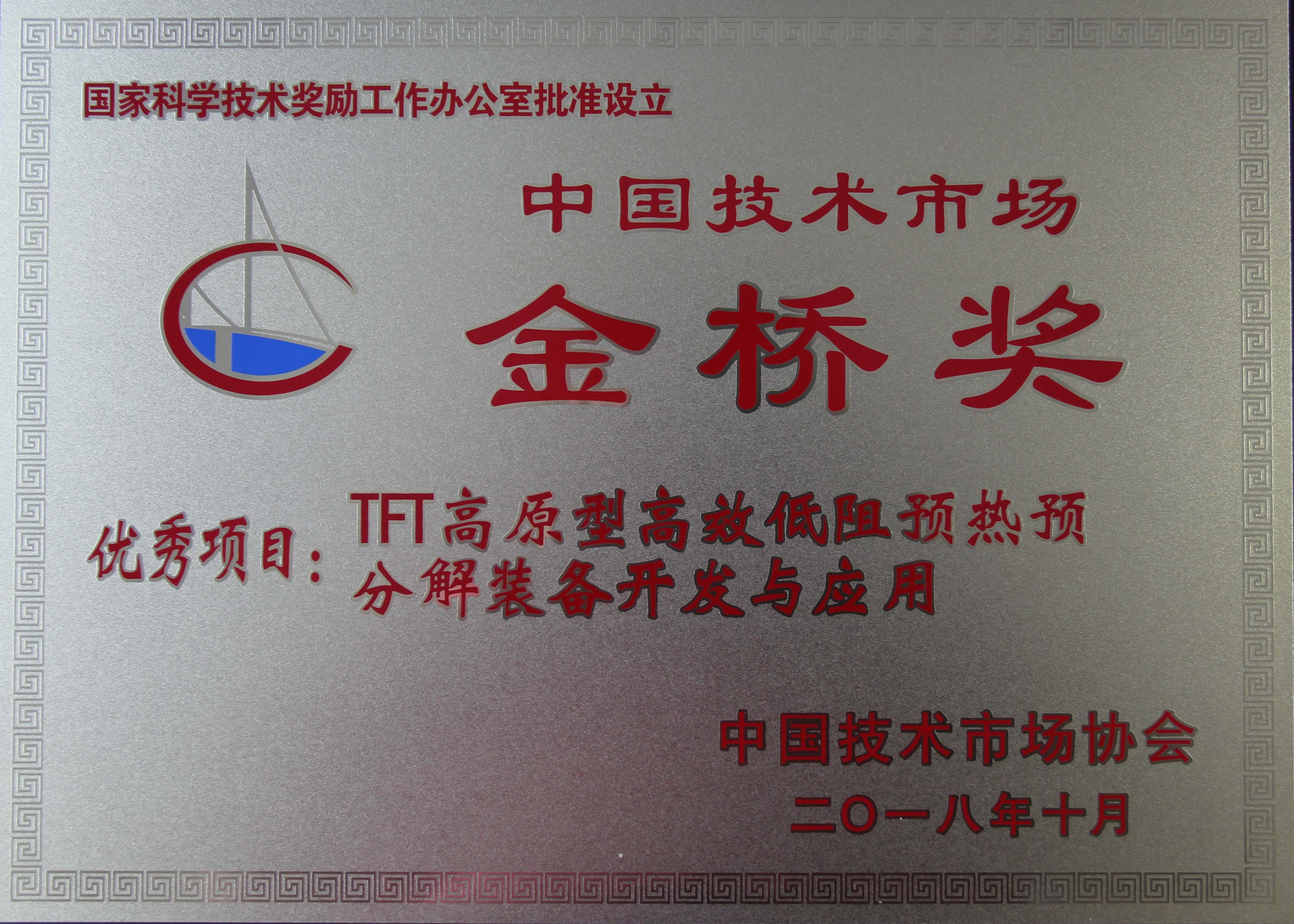 第九屆中國技術市場協(xié)會金橋獎頒獎大會于2018年10月31日在北京召開,我公司繼上屆榮獲先進集體獎后,今年申報的“TFT高原型高效低阻預熱預分解裝備開發(fā)與應用”項目經(jīng)第九屆中國技術市場協(xié)會金橋獎評審委員會評審,榮獲優(yōu)秀項目獎。