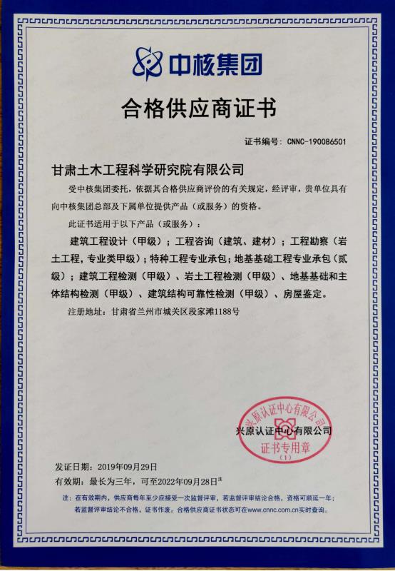 近日,公司成功通過(guò)中核集團(tuán)興原認(rèn)證中心有限公司和中核集團(tuán)合格供應(yīng)商專家委員會(huì)及管理委員會(huì)審核認(rèn)證,順利獲得建筑工程設(shè)計(jì)(甲級(jí));工程咨詢(建筑、建材);工程勘察(巖土工程,專業(yè)類甲級(jí));特種工程專業(yè)承包;地基基礎(chǔ)工程專業(yè)承包(貳級(jí));建筑工程檢測(cè)(甲級(jí))、巖土工程檢測(cè)(甲級(jí))、地基基礎(chǔ)和主體結(jié)構(gòu)檢測(cè)(甲級(jí))、建筑結(jié)構(gòu)可靠性檢測(cè)(甲級(jí))、房屋鑒定的合格供應(yīng)商資格。